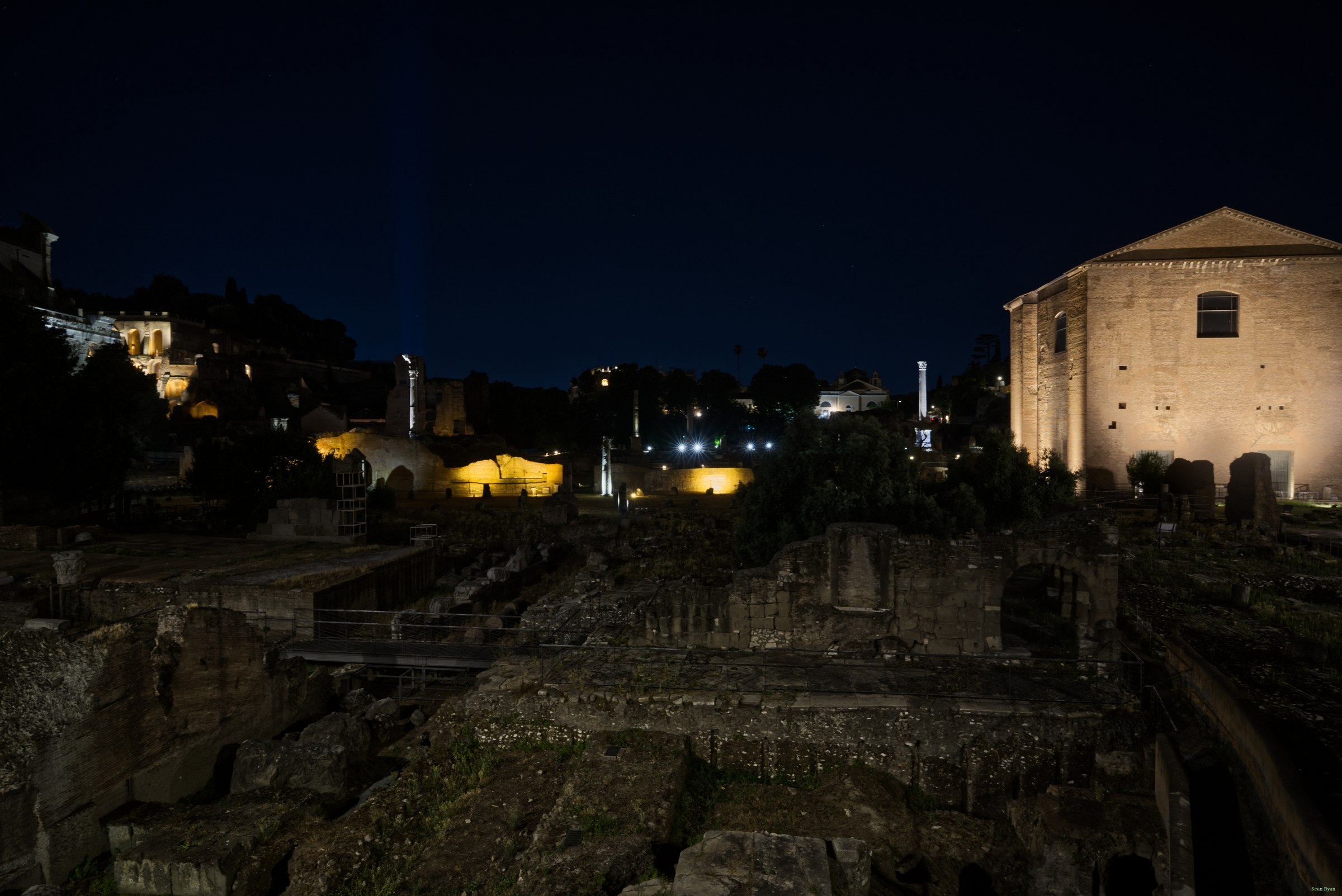 The Tempio di Venere Genitrice [46 BC] of Rome, by night. Dedicated by Julius Caesar in 46 BC. Rebuilt multiple times after fires, with the visible remains belonging to a reconstruction from the late 3rd/early 4th century AD.