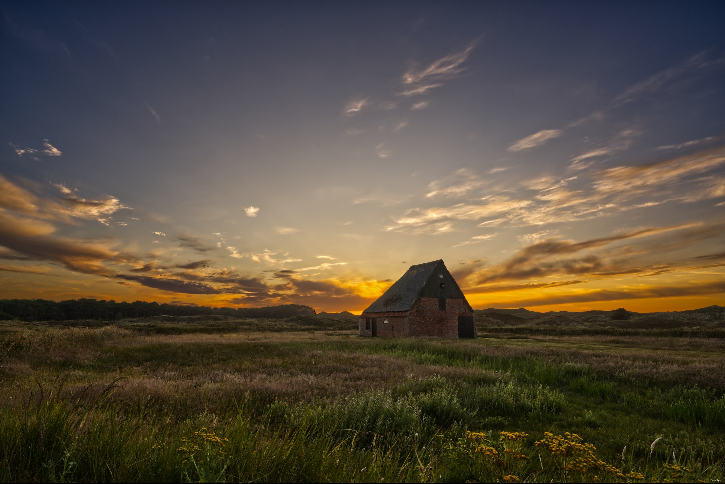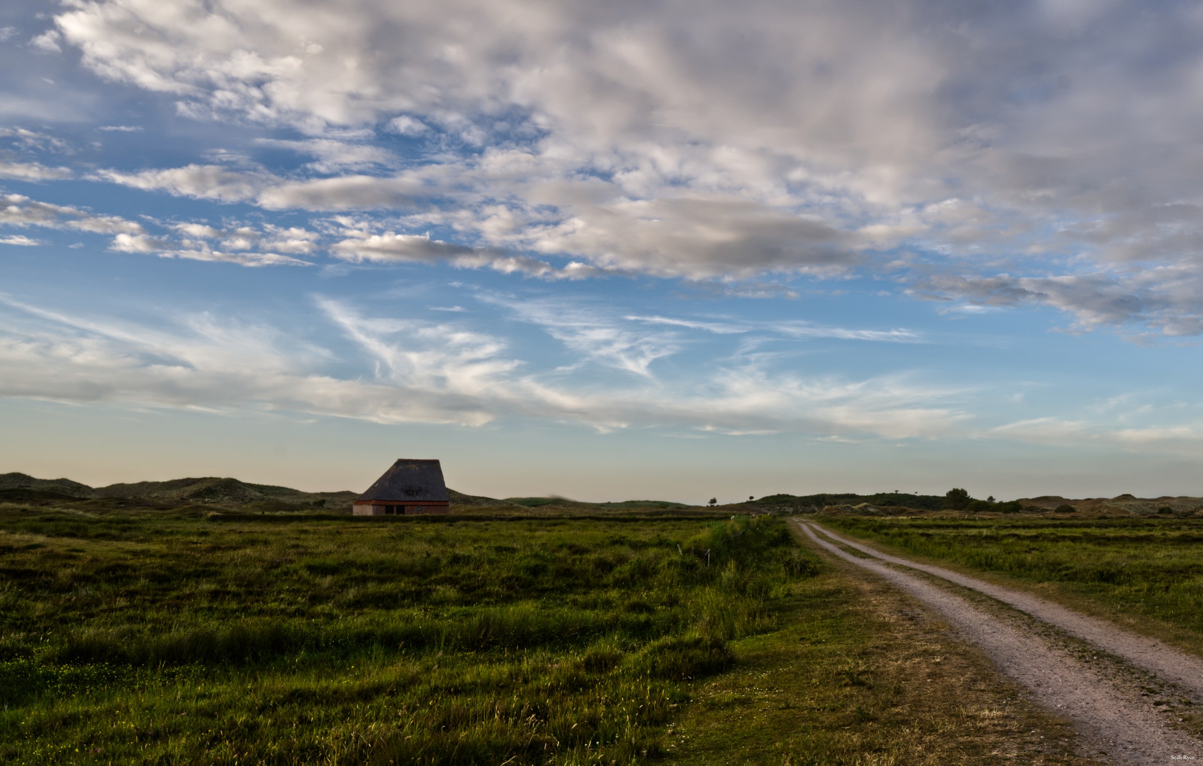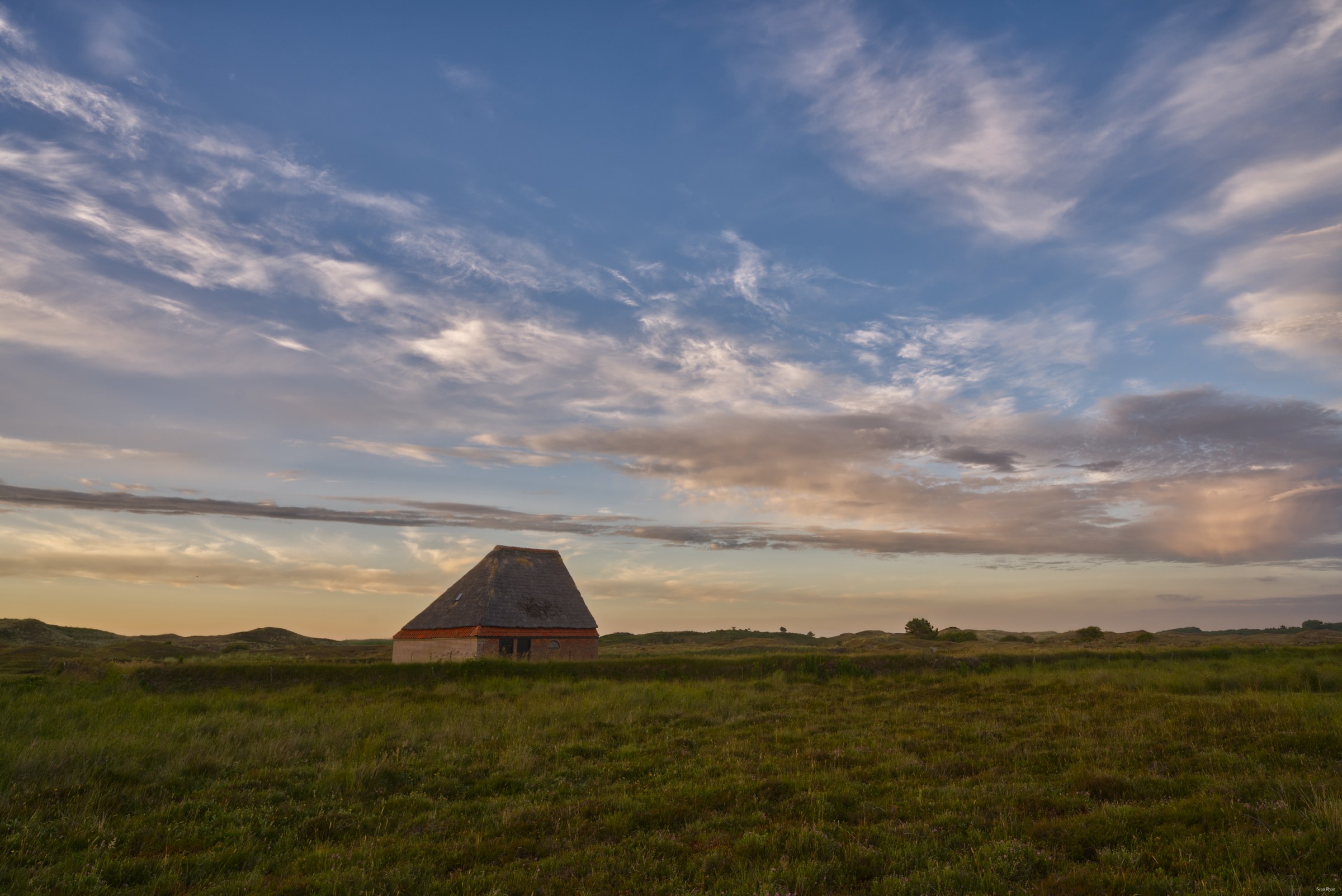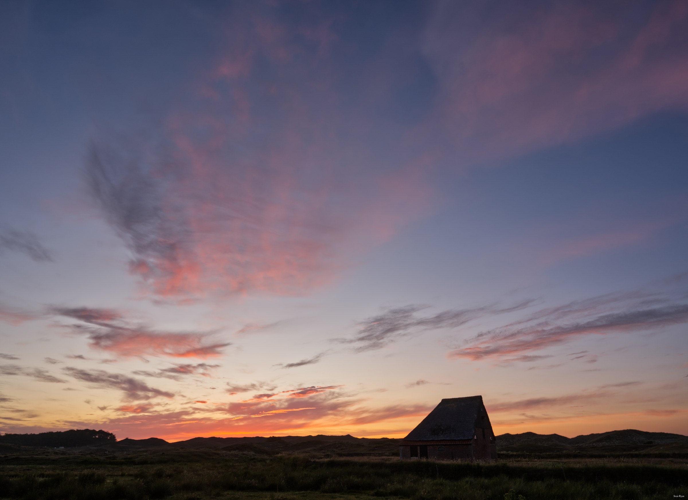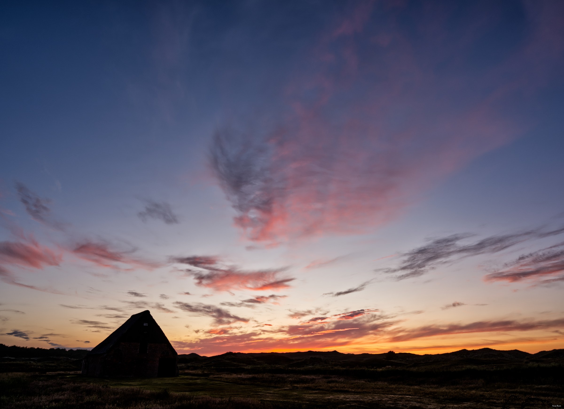 Cloud trails and night skies at a typical Texel thatched hut (schaaphuis 'sheep house'), by day, by sunset and at blue hour.