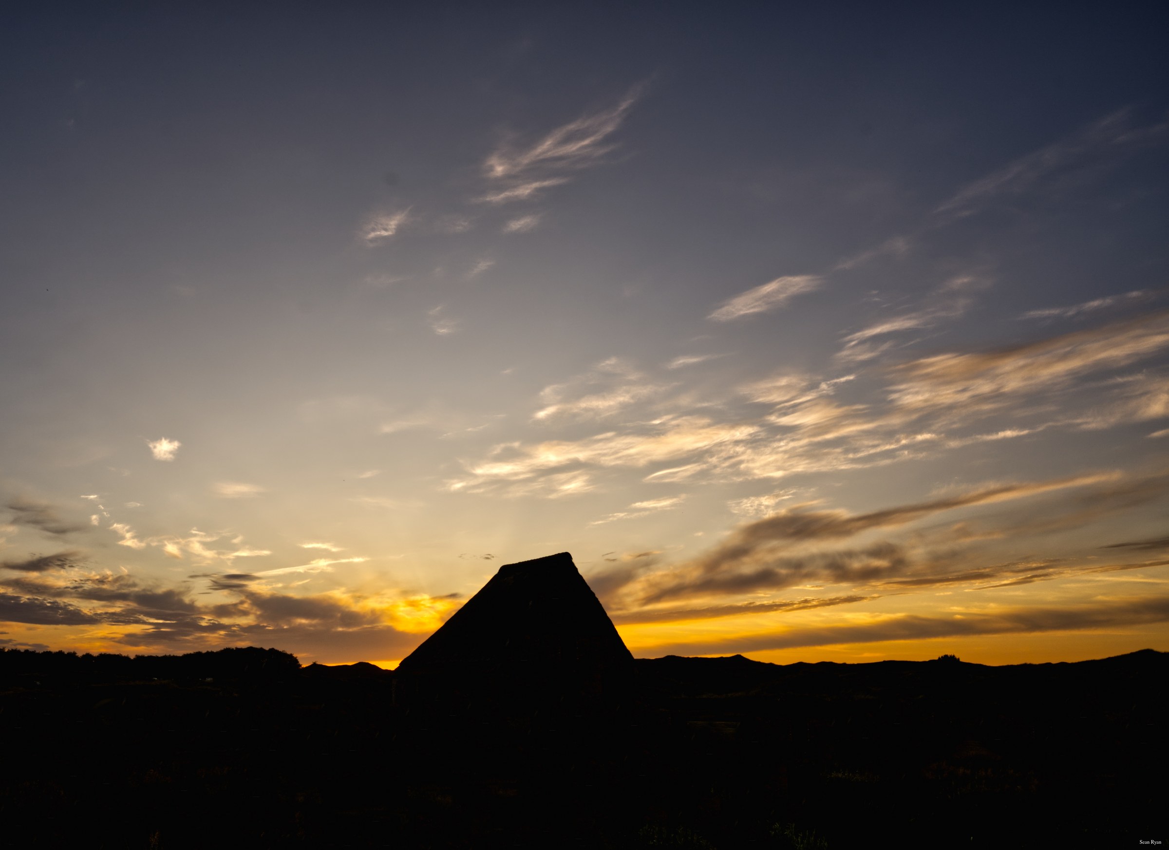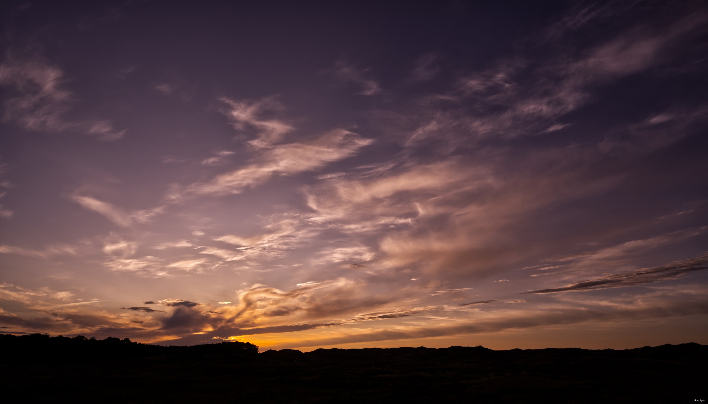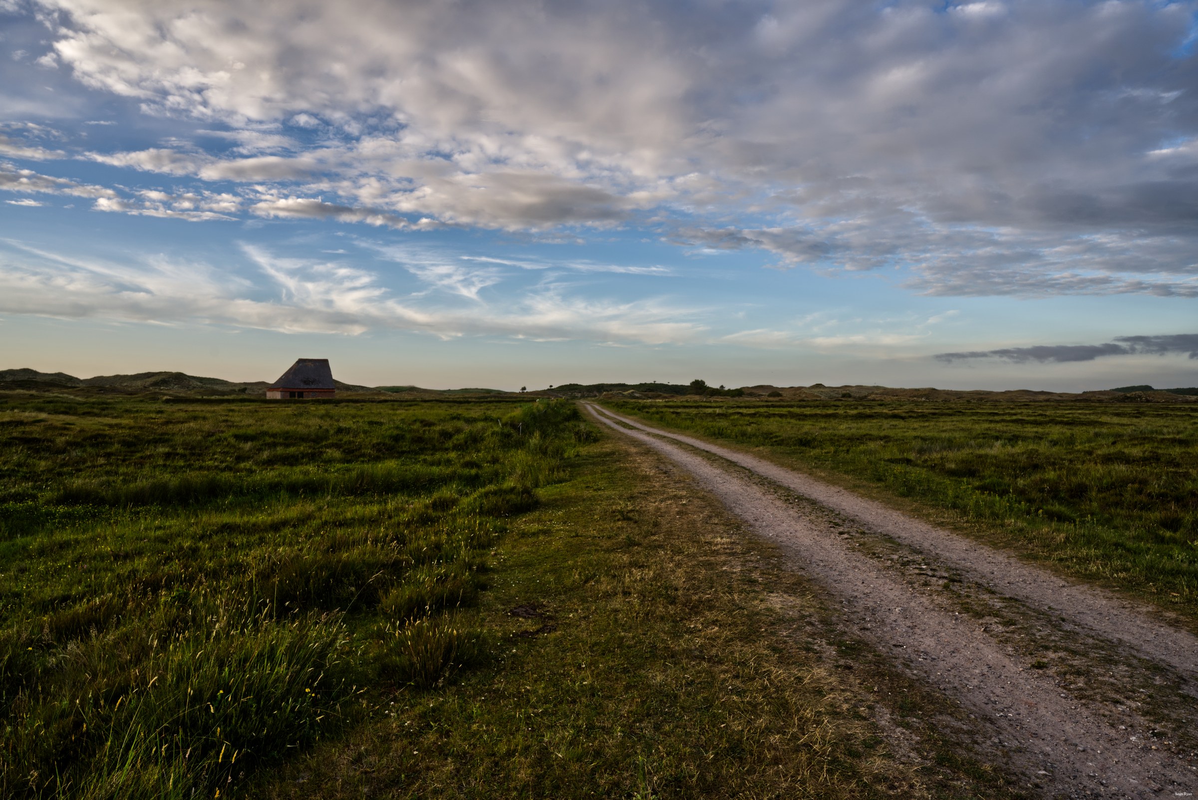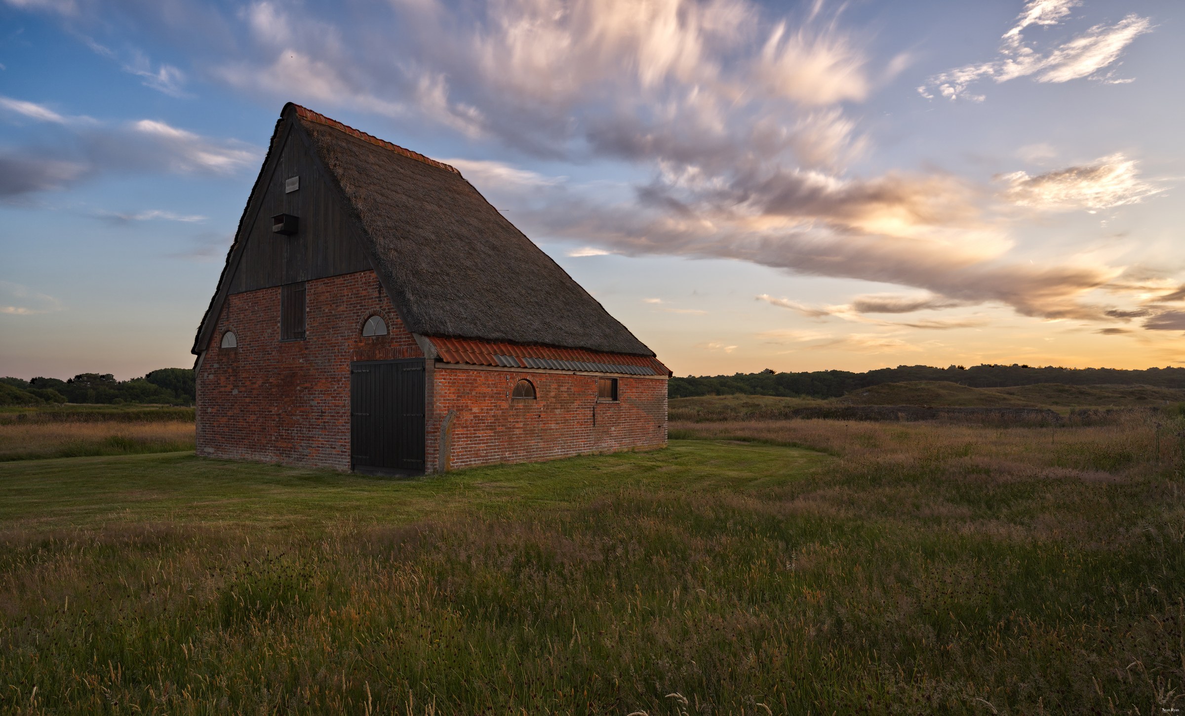 Cloud trails and night skies at a typical Texel thatched hut (schaaphuis 'sheep house'), by day, by sunset and at blue hour.