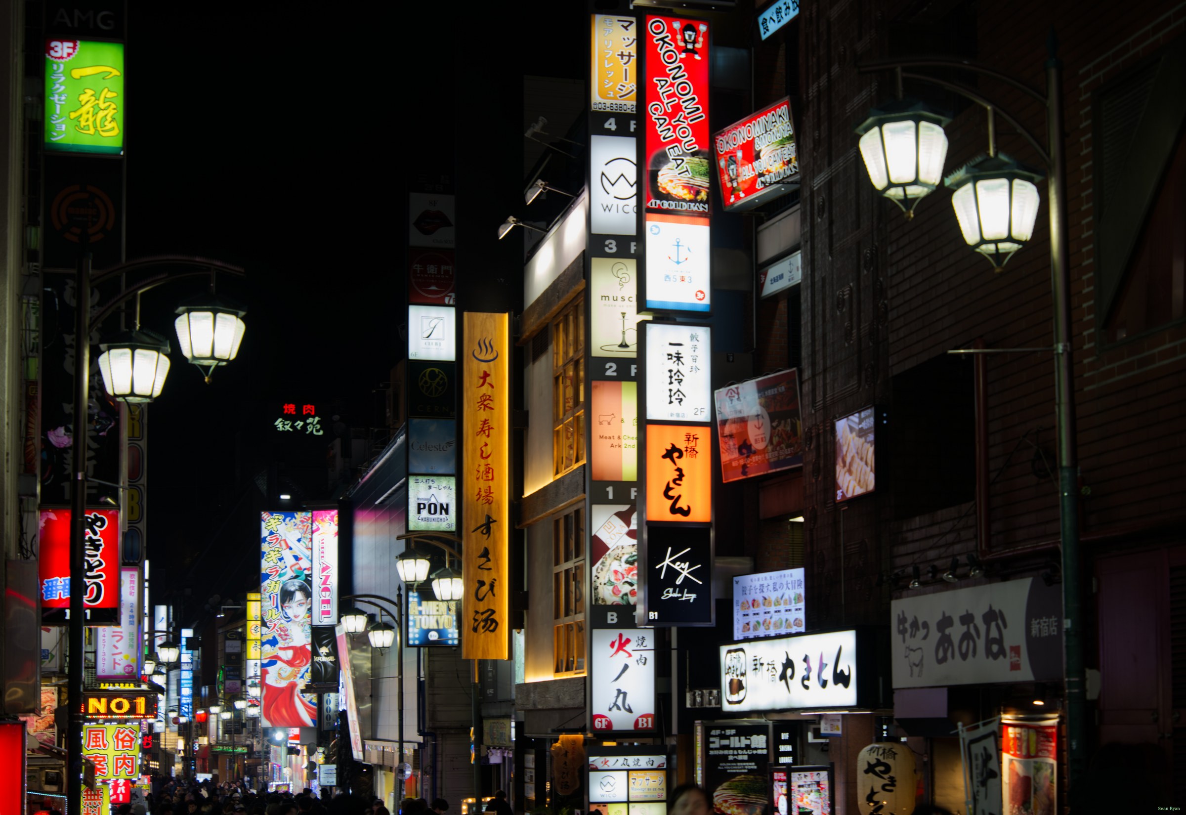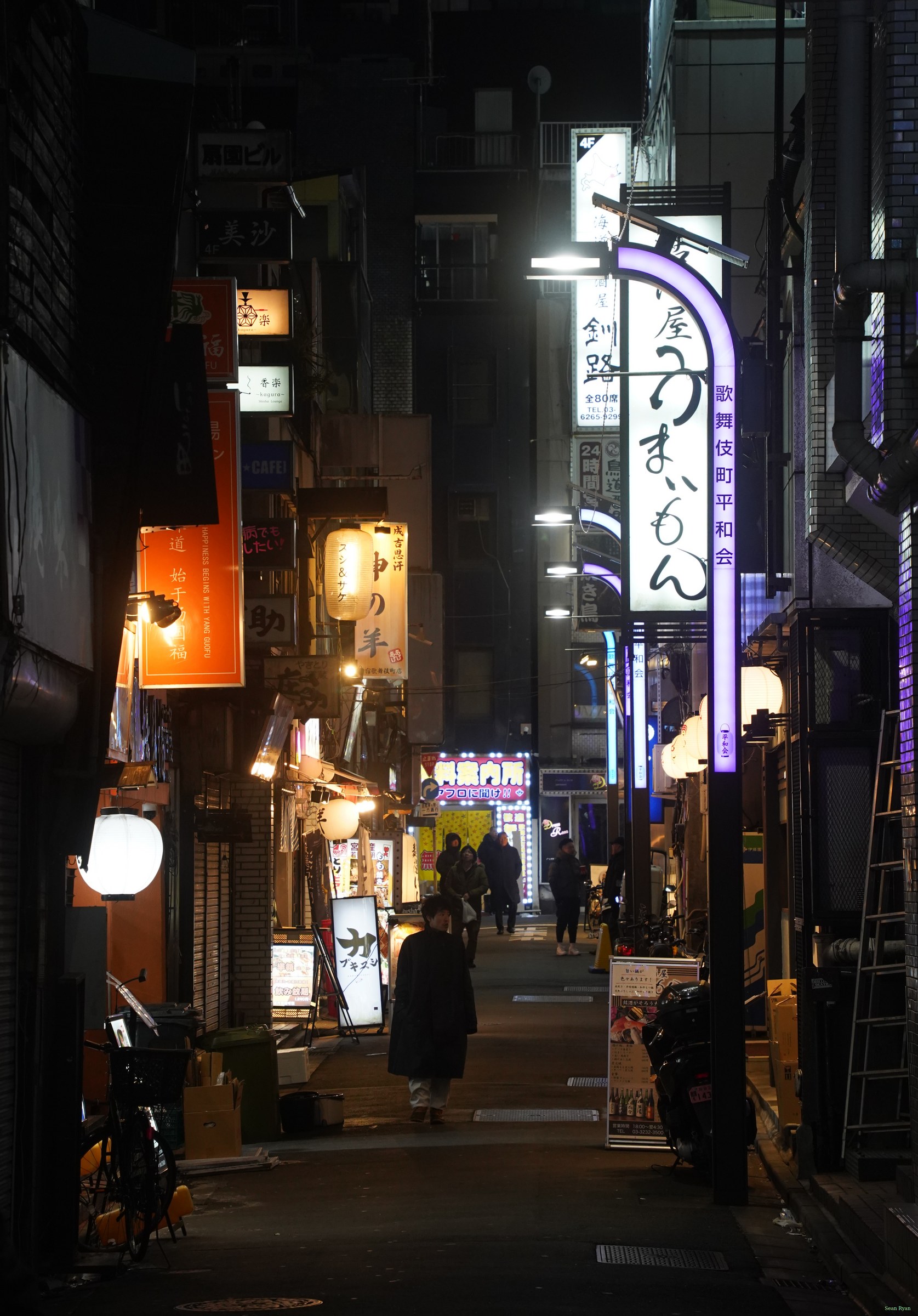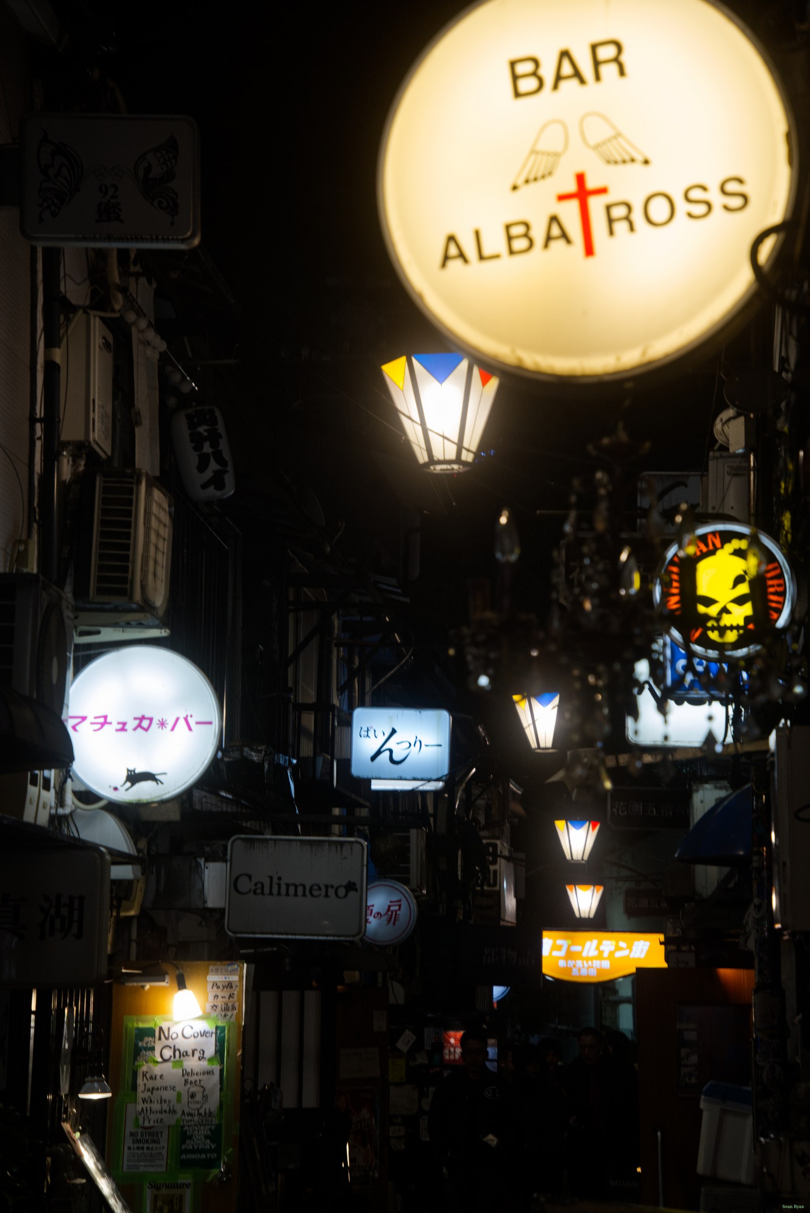Bar and shop signs by night in the alleyways of Shinjuku, Golden Gai.